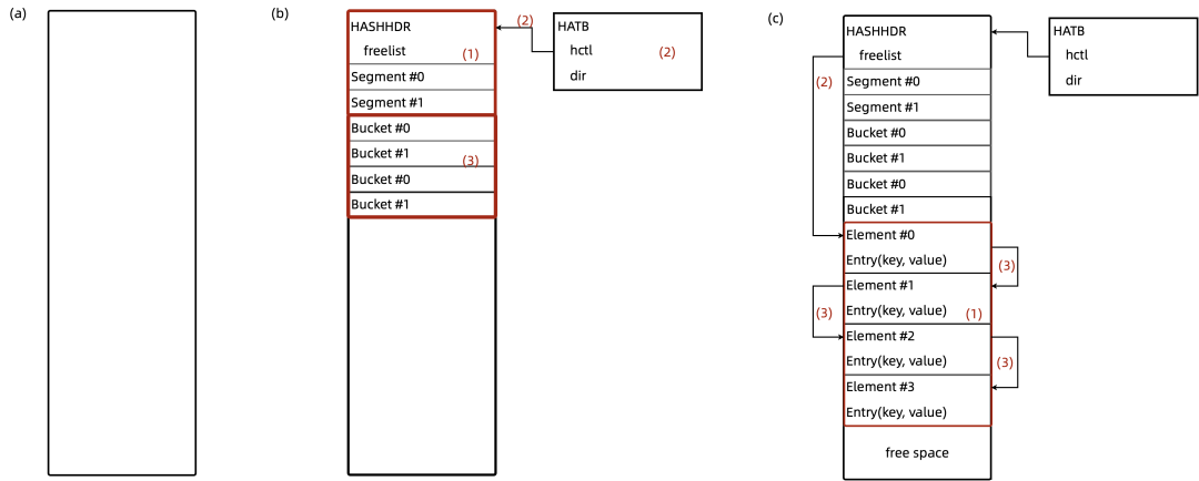 由init_htab对通过DynaHashAlloc申请DIR也就是Segment数组,同时申请Segment也就是Bucket数组进行初始化,并计算后续每次再分配的Element数量;