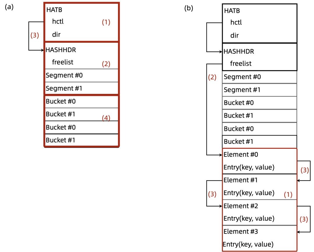 Dynamic Chained Hash Tables,由HTAHCTL,HTAB,HASHHDR,HASHDIR,HASHSEGMENT,HASHBUCKET,HASHELEMENT,6种结构构成。