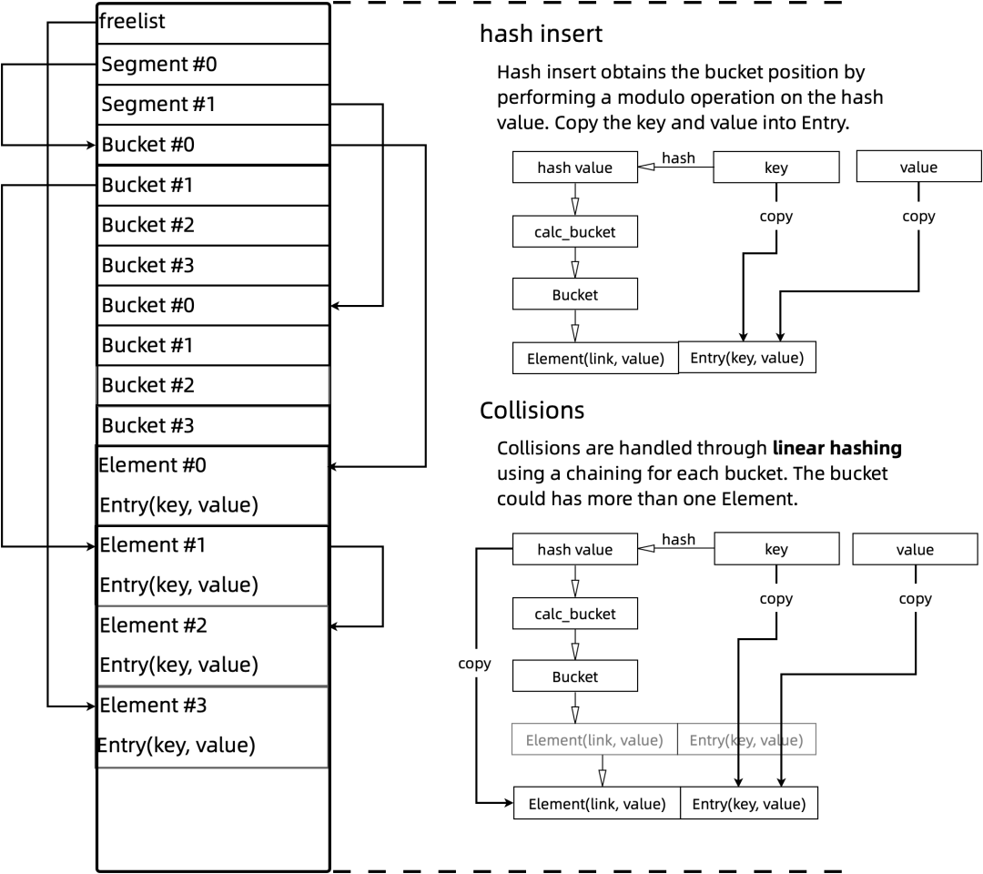 当calc_bucket找到的bucket为NULL或者在此bucket指向的所有Element的key和插入元素的key不同时,才会进行插入。当不同的key得到的hash value在同一个bucket上时,会将数据写入到Element,并由上一个Element的link指向当前插入的Element。Element分为两部分,一部分是是指向下一个Element的指针link和hash_values以及在按照HASHCTL设置的entrysize申请的内存区域: