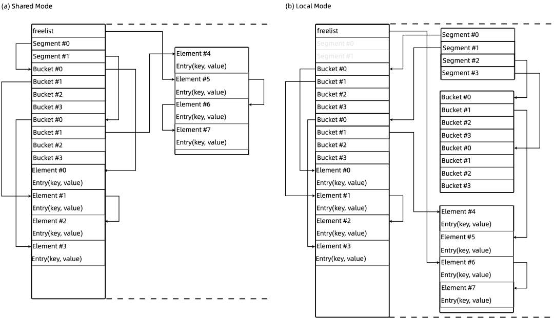 在本地模式中,上述结构体都将存储在本地Memory Context分配的内存种;而共享模式时,HTAB结构将会存储在本地Memory Context分配的内存,其他都将会存储到Shared Memory中。HTAHCTL储存在栈上,执行完生存函数后即被释放。