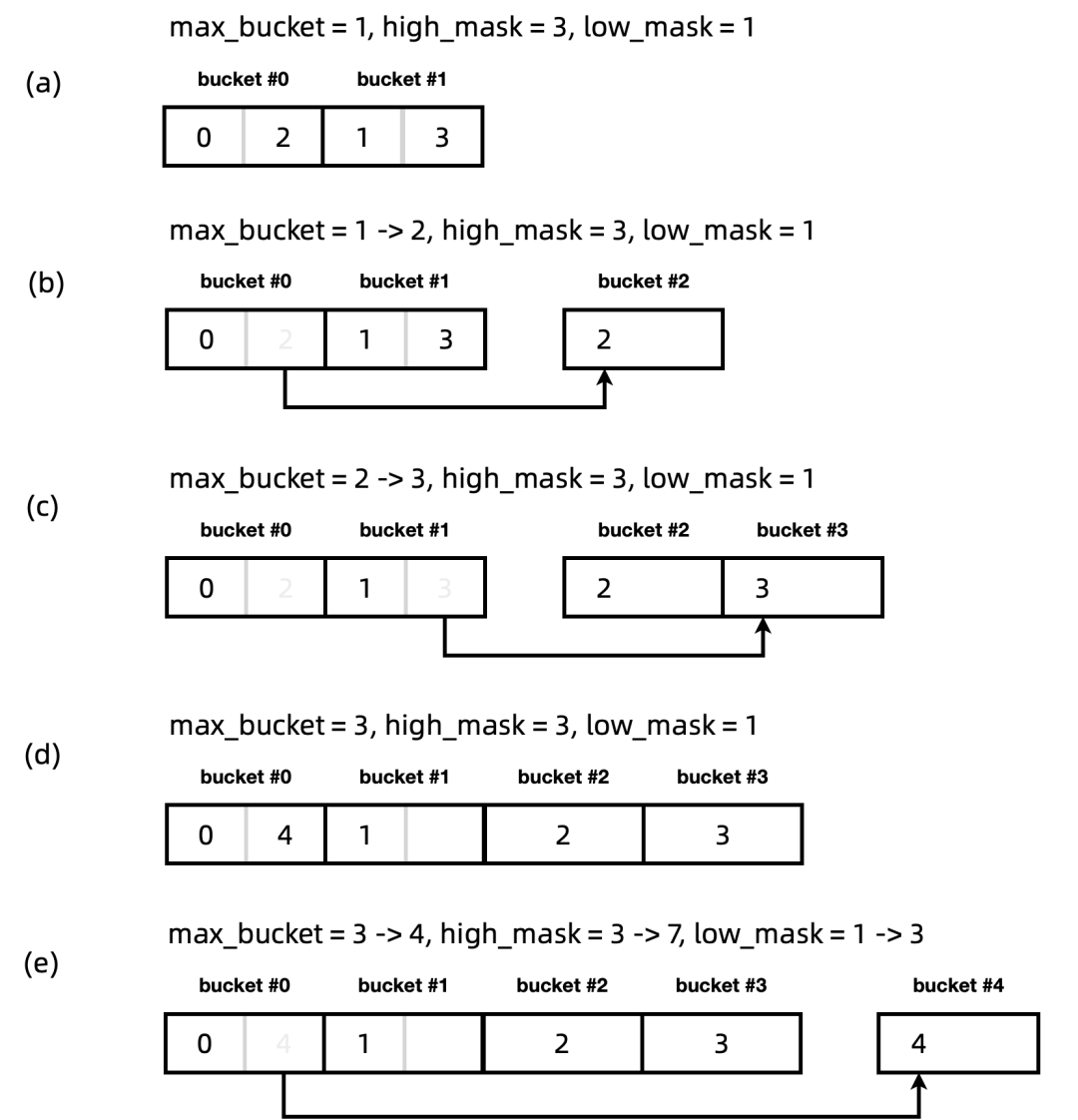 在执行上面操作时,都会通过calc_bucket根据hash_value查找对应bucket。calc_bucket是根据当前bucket数量,和high_mask或low_mask计算得到的bucket位置的;