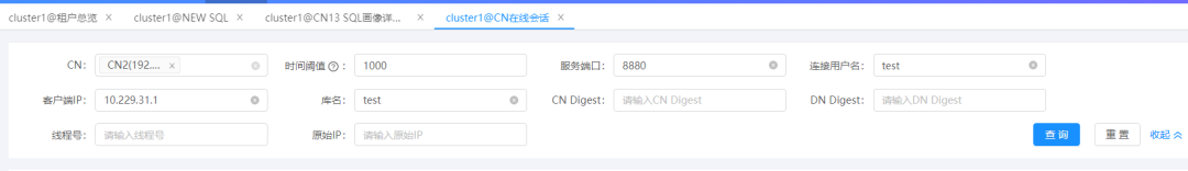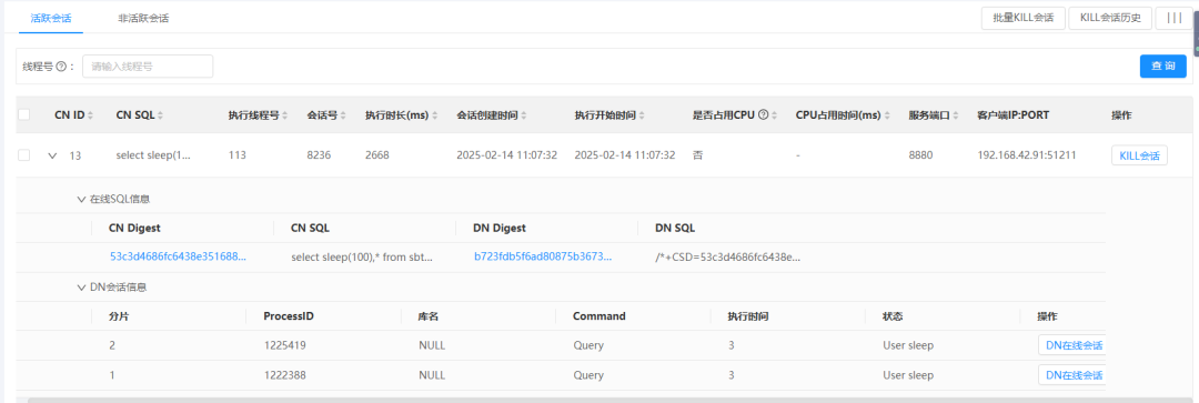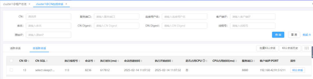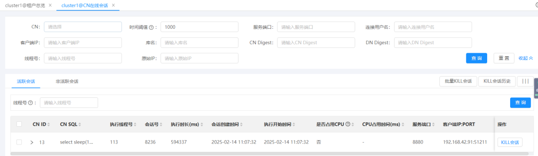 活跃会话功能聚焦于实时跟踪正在执行SQL的会话,在这一维度,系统会详细展示DN节点(数据节点)的执行细节,会全面呈现SQL语句的具体内容、执行过程中的资源消耗等关键信息。以图1中的活跃会话查询页面为例,用户能够直观、清晰地获取各项关键数据。