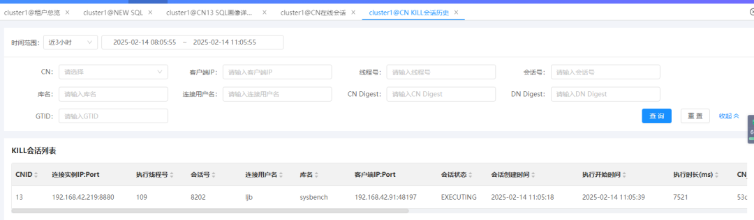 通过该页面,用户能够便捷、快速地检索出占用大量资源的语句。当数据库遭遇性能瓶颈时,运维人员可借助活跃会话查询功能,精准且迅速地定位到当前执行时长显著、资源消耗量大的SQL语句,并进行诊断和查杀。
