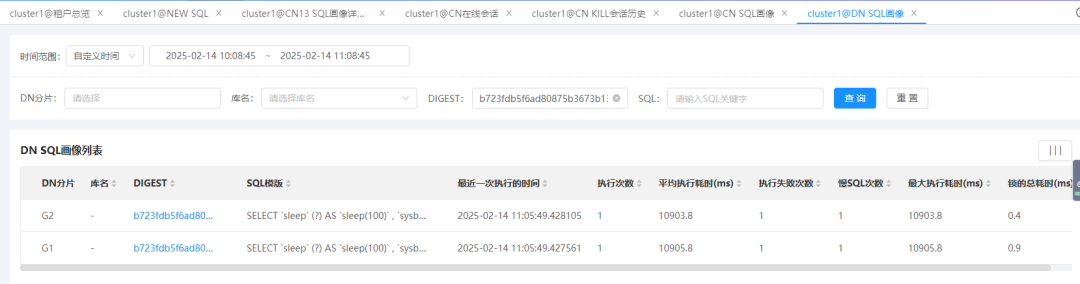 运维人员通过此功能可清晰查看各数据节点的会话执行情况,如SQL执行次数、平均耗时、失败次数、慢SQL次数等关键指标,并可进一步进入SQL画像进行深度诊断。