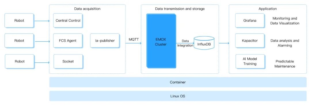 系统性能方面,工业环境对时延要求极高,平台需要在数据量大、硬件性能差、带宽受限的条件下,实现毫秒级数据传输并保障系统稳定运行。同时,车间内机器人设备品牌众多,数据格式和接口标准不统一,平台必须解决海量数据格式转换和多品牌设备兼容性问题。数据传输方面,智能工厂 7×24 小时不间断运行产生海量数据,平台需要满足亿级/天的数据传输需求,同时确保数据的完整性、持续性和安全性。生产车间存在大量老旧设备,其综合性能落后,为保证生产安全,制造部门对服务器主机 CPU 使用率设置了严格限制,这给系统资源调度带来巨大压力。数据处理方面,平台需要支持对海量数据的快速并发写入、高效压缩存储和实时查询分析,以满足操作人员查看设备年/月/周/日运行状态和趋势分析的需求,这对系统的数据处理能力和可视化性能提出了严峻考验。针对以上挑战,该企业在整体方案中构建了一套端到端的机器人设备管理平台。该方案采用 MQTT 协议作为数据传输标准,依托企业级 MQTT 接入平台 EMQX Platform 的高吞吐、低延时特性,结合 Intel EII 工业边缘洞见平台的模块化、容器化架构,实现了从生产线 Robot 端 - 中央控制器 - 工控机 - 服务器 - 到 Web 端的全链路数据贯通。基于该企业自研的机器人数据采集软件 ia-publisher,南向通过 Socket 通信方式收集中央控制器数据,采集数据包含 Robot 运动的扭矩 Torque、脉冲 Pulse、不同动作的 Z 轴坐标、Vacuum Time、Robot Speed、Glass 不同 X、Y、Z轴的偏移量、Total Time 和不同轴别运动时的温度监控等。考虑到机器人设备高并发的海量数据,选择单集群支持传输与处理吞吐量可达每秒百万级的 EMQX Platform 消息代理服务器作为消息收发通道,通过采集软件 ia-publisher利用 MQTT 协议将采集的数据发布至指定的 broker 之中。结合 EMQX Platform 开箱即用的数据集成能力,与时序数据库 InfluxDB 集成,在保障数据安全、满足企业合规需求的同时,实现高可靠的数据存储。使用 InfluxDB 集成 Grafana 提供的可视化数据面板,满足不同类型的数据查询和分析,方便操作人员实时观测 Robot 设备的运行状态。采用 Kapacitor 对数据进行分析筛选,设置极值阈值区间,对超出阈值的数据进行邮件预警,从而减少故障损失并提升生产效率。同时,利用实时采集数据对大数据智能预测模型进行训练,拟合未来故障时间点曲线,实现可预测性维护。自机器人实时诊断预警平台上线后,单个厂区成功接入超过 500 台工业机器人设备,日均处理消息量达千万级别。凭借高并发、低延迟、高可用性和无限横向扩展的能力,该平台显著提升了生产效率,降低了故障损失和维修成本,累计节省超过 500 万元。通过收集机器人的各项运行数据,平台实现了对机器人状态的标准化和系统化管理。操作人员可以利用可视化工具查看机器人各轴在不同时间周期的运行状况,并设置个性化阈值。一旦数据超出设定阈值,系统会立即通过邮件发送异常告警,促使操作人员迅速响应,减少潜在生产损失。此外,平台还支持深入分析异常记录,基于波形对比分析,扭矩负载时频分析等方法,帮助操作人员详细记录和理解异常事件。通过持续监测和分析这些数据,平台不仅能够准确识别故障原因和定位故障点,还能基于历史数据分析,实施预防性维护措施,有效避免生产中断。基于 EMQX Platform 构建的机器人实时诊断预警平台,帮助该企业成功破解工业物联网场景下的海量连接、实时处理与智能分析难题,推动设备管理从「被动响应」到「主动预防」的转变,构建起数据采集、传输、存储与分析的全栈能力,为半导体显示行业树立了智能化转型标杆。随着平台进一步融合 AI 算法优化预测模型,实时诊断预警平台可以扩展到仓储物流、环境监测等其他场景,持续释放工业数据价值,驱动智能制造的升级和演进。