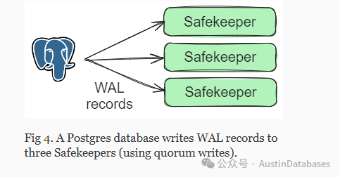 Postgres 实例的 WAL 写入到三个 Safekeeper 节点的集群。每个 Postgres 数据库负责将 WAL 记录写入每个 Safekeeper,而不是写入一个领导者节点,然后该节点将这些记录复制到跟随者。