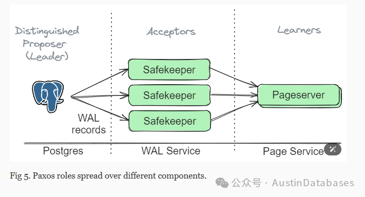 Neon 为其 WAL 服务选择了 Paxos 实现。每个 Postgres 数据库都是一个提议者(Proposer),每个 Safekeeper 都是一个接受者(Acceptor),Pageservers 是学习者(Learner)。在 Neon Postgres 数据库可以写入 WAL 记录之前,它必须由 Safekeepers 选举为领导者(杰出提议者)。一旦当选,它就可以自由地向 Safekeepers 写入(或提议)一系列 WAL 记录。一旦大多数 Safekeepers 确认了 WAL 记录,数据库就将该记录视为已提交。