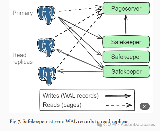 Neon 支持读取副本,但与 Aurora 不同,数据库主实例不会将 WAL 记录流式传输到读取副本。相反,此责任转移到 Safekeepers。这也将读取副本置于 Paxos 学习者的角色,与 Pageservers 并列。