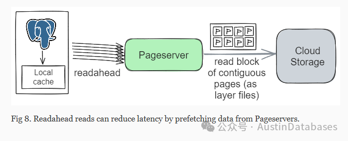 读取首先会命中 Postgres 内存缓冲区中的本地缓存,只有在缓存未命中的情况下,才会向相关的 Pageserver 发送获取页面请求。Pageservers 也是缓存,实现了 LRU 缓存驱逐算法。如果在 Pageserver 上再次发生缓存未命中,它将从云存储(以层文件的形式)获取一个页面块。