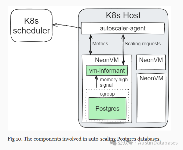 计算层: Neon 使用自己的虚拟化技术,将多个租户打包到共享计算实例上。每个 Postgres 数据库都在基于 QEMU 的 NeonVM 中运行,该 NeonVM 在 Kubernetes 中调度。每个租户数据库只有一个主 Postgres 数据库。扩展只能在一个维度上进行,即向上和向下。Neon 通过以下方式处理资源争用: 每个 Postgres 实例都在 NeonVM 的 cgroup 中运行。 vm-informant 进程接收来自 cgroup 的 memory.high 事件的通知。 vm-informant 进程然后向主机上运行的共享 autoscaler-agent 进程请求更多内存。 autoscaler-agent 与(修改后的)K8s 调度器协调,以获得分配更多资源给 VM 的批准。 Neon 使用 QEMU 的实时迁移功能将 VM 迁移到负载较轻的主机。 存储层: Neon 的分解式存储层通过共享进程资源共享模型和逻辑隔离来实现多租户。WAL 和 Page 服务可以部署在针对工作负载优化的硬件上。租户可以在 Safekeepers 和 Pageservers 之间转移。