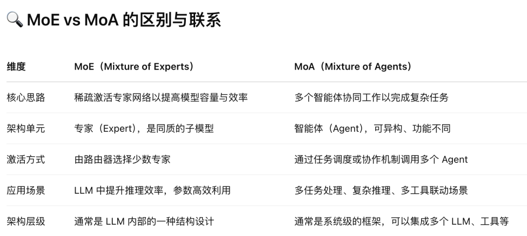 MoA 是一种基于协作智能体的架构设计,强调多个具备不同能力的 AI Agent 协同工作,解决复杂任务。