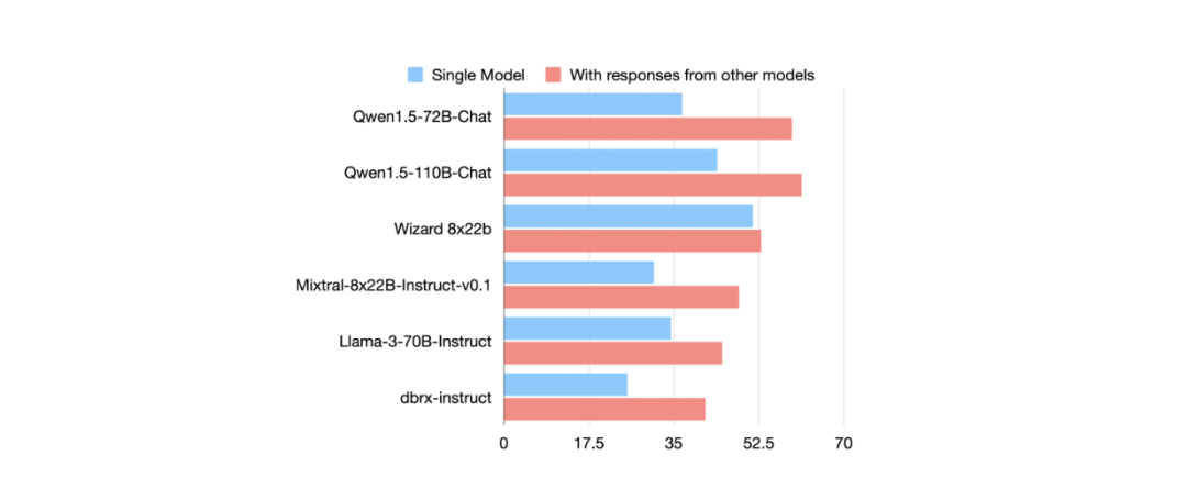 论文作者使用六种 LLM (Qwen、Wizard、Mixtral、Llama 3、dbrx )在 AlpacaEval 2.0 数据集上进行基准测试后,得到了确认。作者比较了 LLM 在两种条件下的回复质量:使用直接输入提示、使用其他模型的回复。他们使用长度控制(LC)胜率指标来衡量质量,该指标能独立于回复长度等可能显著影响评估结果的因素来评估输出质量。