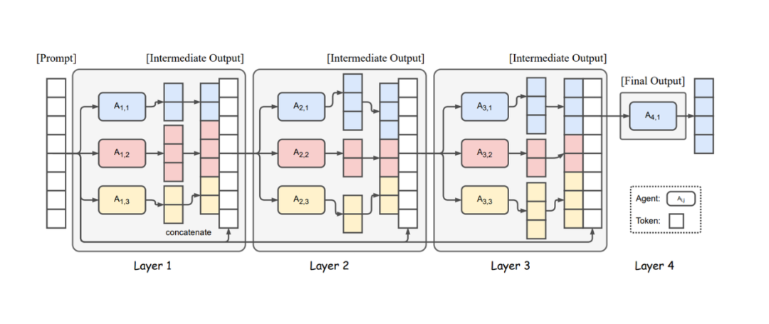该系统由多个层组成,每层包含几个不同规模和能力的 LLM。第一层 LLM 针对输入提示独立生成回复。然后,这些回复作为输入呈现给第二层的 LLM,第二层的模型再独立生成自己的回复。这个循环在后续层中持续进行,直到到达最后一层。最后,一个 LLM 将最后一层的回复综合成最终回复提供给用户。