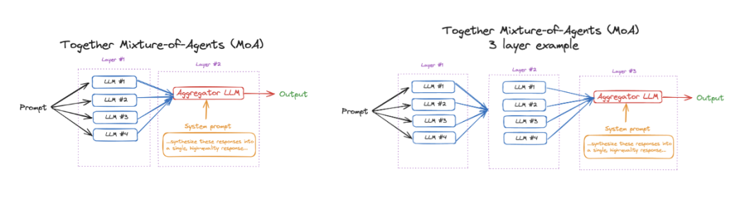 图:两层 MoA(左图)与三层 MoA(右图)对比