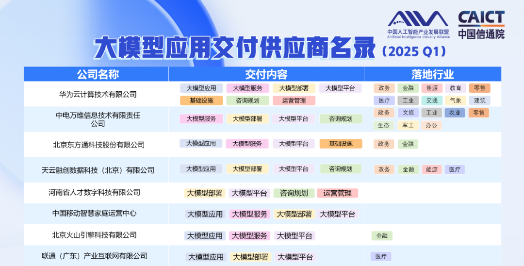 2025年4月9日,中国信通院与AIIA联合发布《大模型应用交付供应商名录(2025年Q1)》,受访企业涵盖十四个省市,系统梳理了国内大模型应用交付供应商的能力分布,旨在为供需双方提供权威参考,推动产业链上下游高效协作,加速大模型技术价值释放。天云数据大模型Elpis成功入围,在政务、金融、能源、医疗等行业提供落地应用服务。