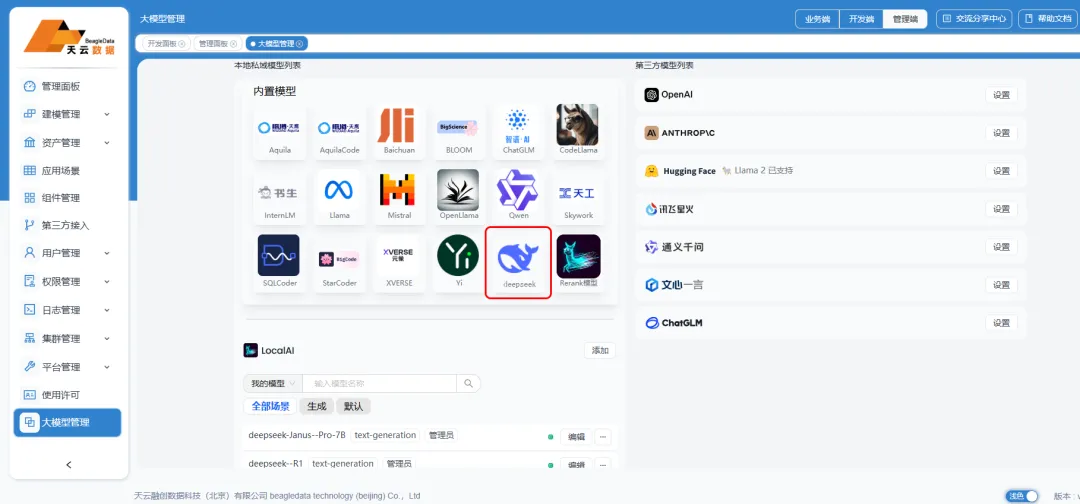 天云数据MaaS平台通过强化学习自动化引擎与动态蒸馏接口,进一步释放硬件潜力,推出预训练CoT模型库,覆盖金融风控、医疗诊断、影视文娱等场景。例如,在医疗领域,平台提供基于CoT的临床决策支持模型,可自动解析患者病史、生成鉴别诊断链。天云数据MaaS平台内置近20款模型,包含Aquila、AquilaCode、Baichuan、BLOOM、ChatGLM、CodeLlama、InternLM、Llama、Mistral、OpenLlama、Qwen、Skywork、SQLCoder、XVERSE、Yi、Rerank、Deepseek等,又以api的方式接入第三方模型OpenAI、ANTHROP\C、HuggingFace、讯飞星火、通义千问、文心一言、ChatGLM等。
