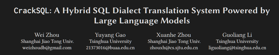 本周推荐的是arxiv 2025.4上的论文:CrackSQL: A Hybrid SQL Dialect Translation System Powered by Large Language Models,作者来自上海交通大学和清华大学。