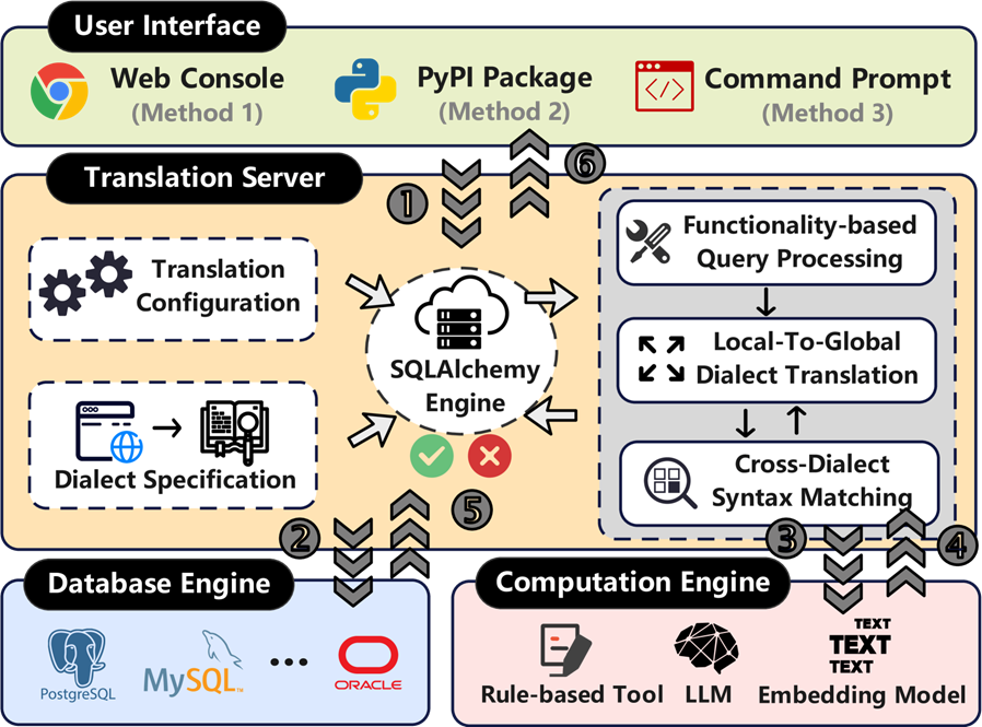 CrackSQL 通过一种混合方法来应对这一挑战,该方法结合了基于规则的系统和大型语言模型(LLM)的优势,同时减轻了它们各自的弱点。如图 1 所示,该系统提供了多个接口(Web 控制台、PyPI 包和命令提示符),并利用复杂的翻译服务器在不同方言之间转换 SQL。