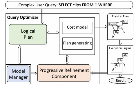 为了识别复杂用户查询,nsDB中查询优化器的设计原则是:通过渐进式查询优化实现性能和准确性目标。首先利用模型管理器提供的AI操作符元数据、成本模型和计划生成器来生成初始物理执行计划。在查询执行期间,触发器观察中间结果并识别到目前为止获得的Pareto边界。渐进式细化组件通过考虑AI模型的运行时统计数据和元数据来细化执行计划。因此,执行计划将被渐进地动态调整。