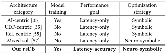 解决上述问题的一个直接的想法是结合符号系统和神经系统的能力。一些文献研究了将ML任务集成到数据库系统中。这些年来,学术界和行业内都提出了许多技术。现有解决方案的架构可以分为三个代表性类别:以AI为中心,以UDF为中心和以关系为中心。研究者们也通过集成了上述三种架构类别提出了一种新的RDBMS,作为一个混合框架。所有这些解决方案(包nsDB)为各种分析任务提供AI模型推理。然而到目前为止,现有的解决方案都没有达到事实上的标准。主要原因可以归纳为三个方面: 模型训练,性能目标和优化策略。