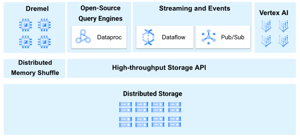 Dremel是BigQuery的大规模可扩展并行查询处理引擎。2006年Dremel最初发布时,存储与计算紧密耦合,但最终将计算和存储分开,以支持原地数据分析。为了支持完整的企业数据仓库功能,BigQuery构建了对托管存储的支持。