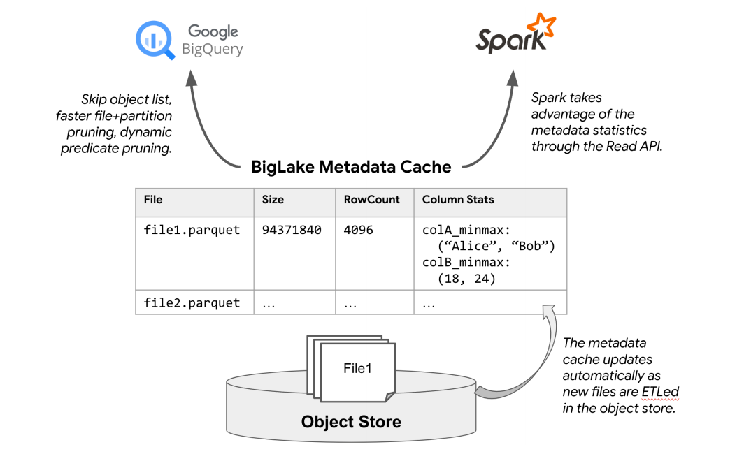 使用Big Metadata,BigLake表在列缓存中缓存文件名、分区信息和数据文件的物理元数据,如物理大小、行数和每文件列级统计信息。该缓存比Hive Metastore 等系统具有更细的粒度跟踪元数据,使BigQuery和存储API能够避免从对象存储中列出文件,从而实现高性能的分区和文件修剪。
