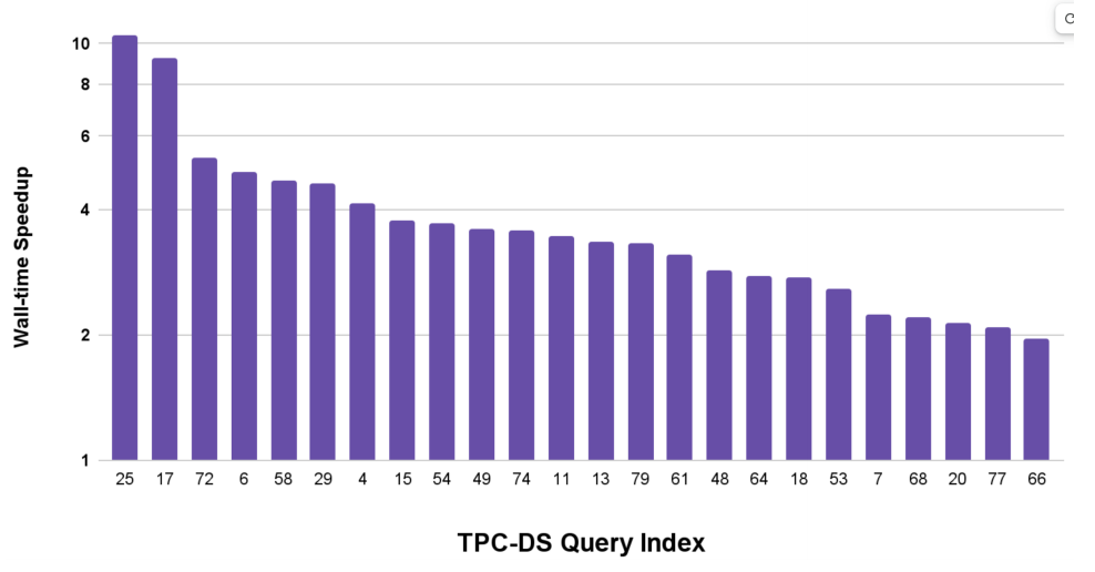 物理元数据管理层收集的统计信息使BigQuery和Apache Spark 查询引擎可以构建优化的高性能查询计划。为了衡量性能提升,在具有2000个槽的BigQuery预留上对TPC-DS 10T 基准进行了功率运行,按顺序执行每个查询。