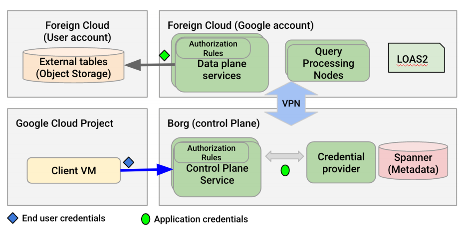 访问外部存储的查询引擎会将查询用户的凭据转发到对象存储,对象存储后再执行数据访问授权检查。这种模型对BigLake表不起作用,原因有两个: