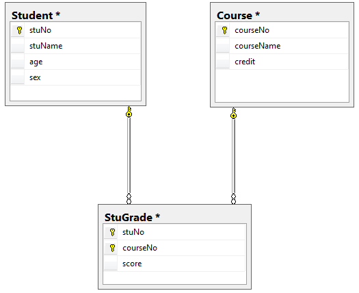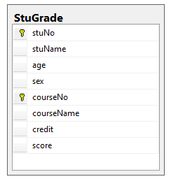 以学生选课为例,每个学生都可以选课,并且有这一门课程的成绩,那么如果将这些信息都放在一张表StuGrade(stuNo,stuName,age,sex,courseNo,courseName,credit,score)。