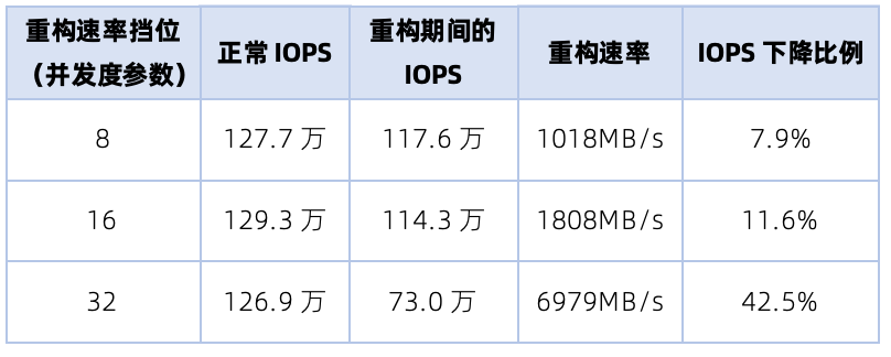 在默认配置下,即重构速率“挡位”为8时,重构速率达到1GB/s,而IOPS下降幅度(即IO影响)仅7.9%。