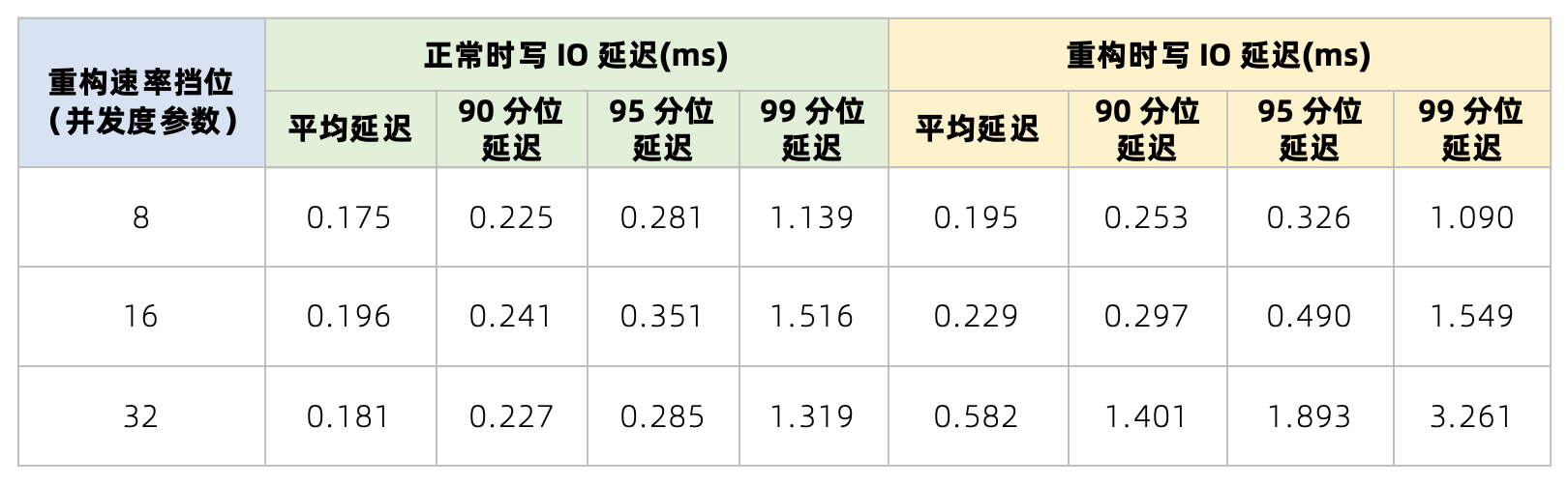 在默认配置下,即重构速率“挡位”为8时,IO平均延迟增加8%~11.4%,P99延迟也只增加6.8%。