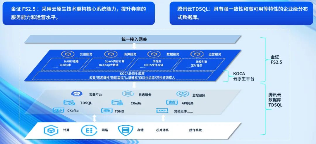 为了更好地支撑金证FS2.5云原生架构升级,腾讯云与金证通过金证KOCA云原生技术平台与腾讯专有云TCE全面适配、金证主流应用与腾讯云数据库TDSQL适配调优、FS2.5云化管理部署与TCE融合,为金证FS2.5提供智能调度和丰富实用的全栈信创云服务,有效满足其业务数字化转型所需;具备多地多中心能力,稳定可靠,保障业务连续性的同时,全面提升券商的服务能力和运营水平。