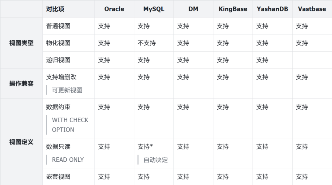 先来看看各家数据库产品在视图能力的大致表现如何。