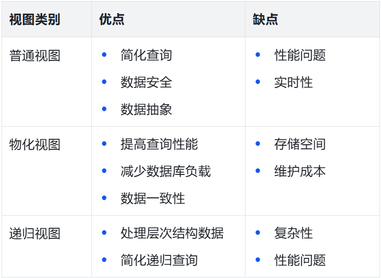 - 物化视图,是一种特殊的视图,它不仅仅保存了查询逻辑,还保存了查询结果的数据。物化视图在性能优化方面具有显著的优势,特别是在处理大型数据集和复杂查询时。通过将查询结果存储在物化视图中,可以避免每次查询时都重新计算,提高查询速度和效率。物化视图在数据仓库和商业智能应用中非常常见,因为它们可以显著提高复杂查询的性能。