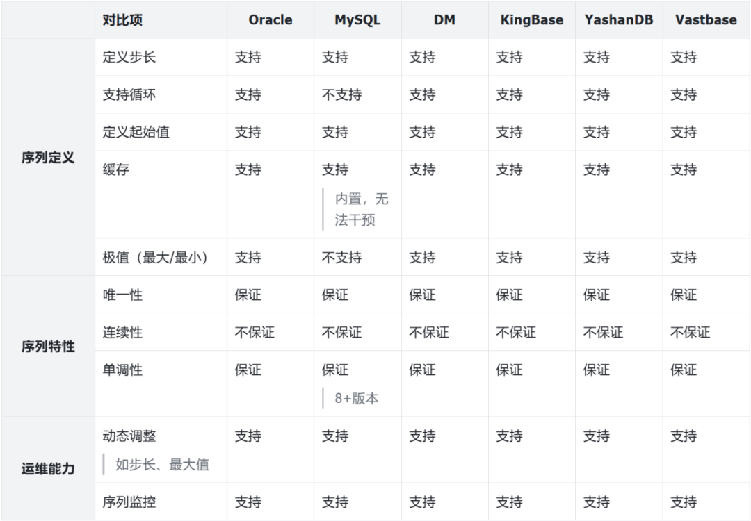 先来看看各家数据库产品在序列能力的大致表现如何,其中MySQL是通过Auto Increment自增字段来等价实现的。