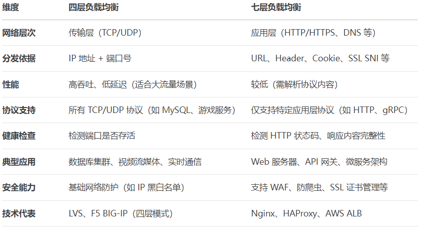 四层负载均衡仅处理IP和端口,转发效率高;同时不解析应用层内容,处理速度快;并且支持所有基于TCP/UDP的协议。缺点是无法根据HTTP URL、Cookie等信息做智能路由;另外只能检测端口是否存活,无法判断服务实际状态。