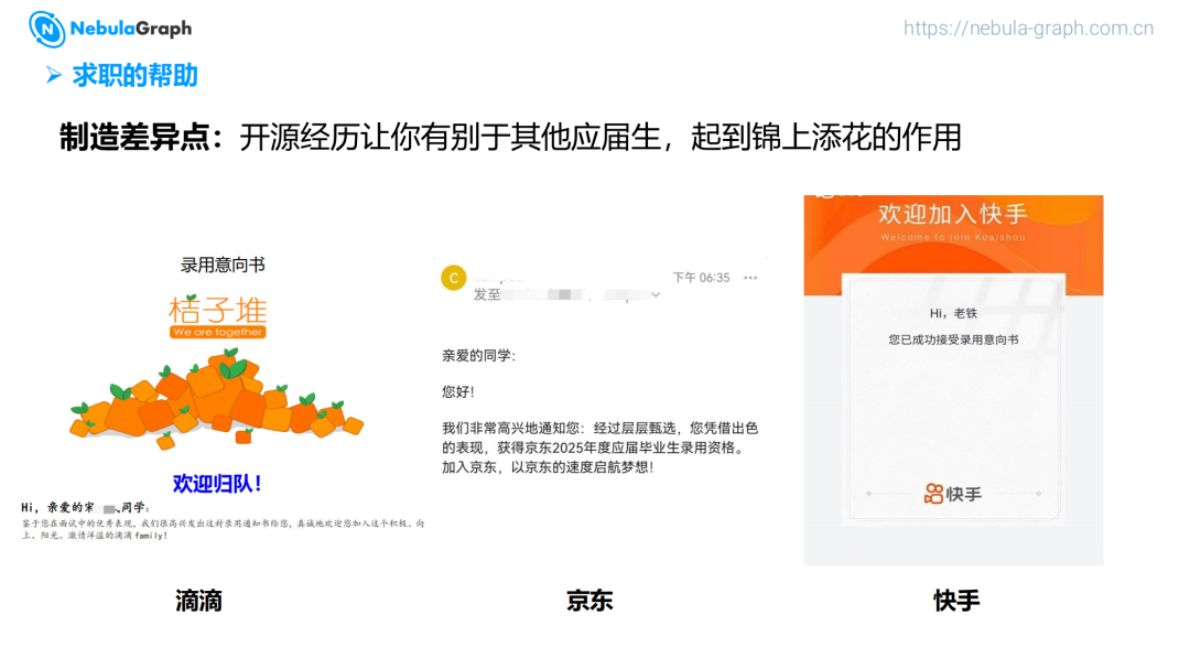 代码能力跃升:你的代码将运行在支撑超大规模数据集群的图数据库中。 实习直通车:顺利结项并经导师推荐,将拥有 NebulaGraph 实习机会。 与大牛同行:4 位顶级导师带你玩转世界级分布式图数据库。 简历镀金:参与 GitHub 万星项目,开源贡献记录永久可见。 硬核成长:从内核到生态工具,贡献真实应用场景。