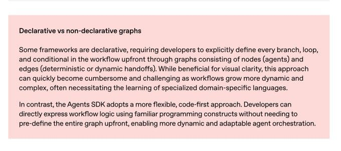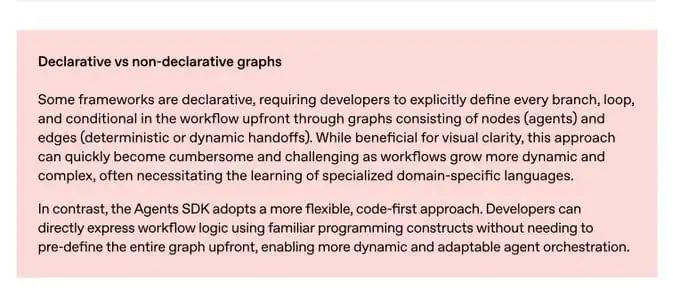 2、“当工作流变得更加动态和复杂时,这种方法很快就会变得繁琐和困难”——这段话的本质问题不是“声明式 vs 非声明式”,而是“workflow vs agent”,用户可以在Agents SDK 中以声明式图的方式表达代理逻辑。