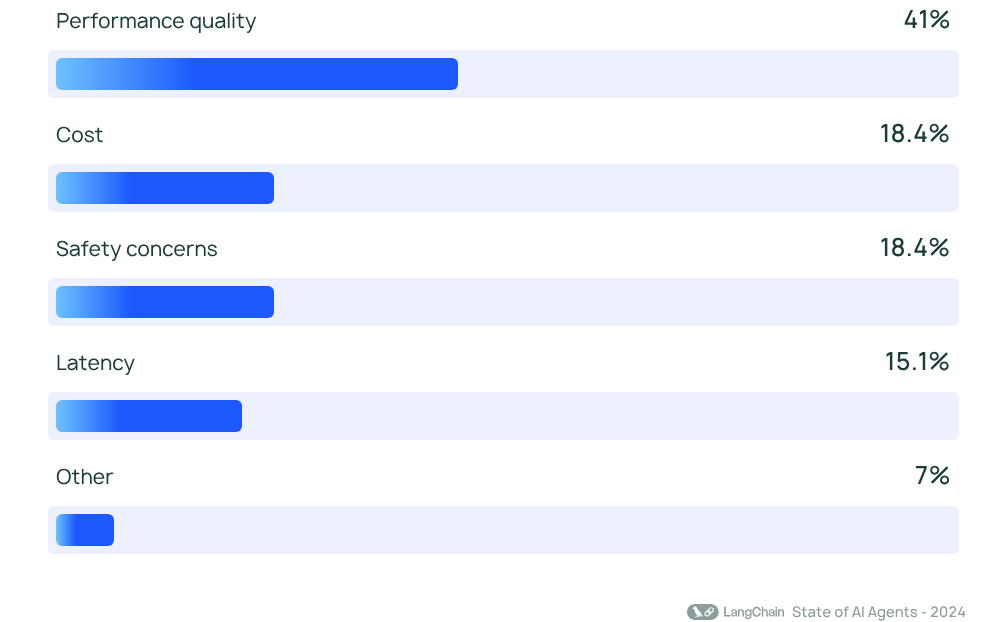 Langchain曾经围绕agent落地做过一个调查,发现影响其落地的最大桎梏在于“性能质量”,而性能质量瓶颈的来源是大模型。