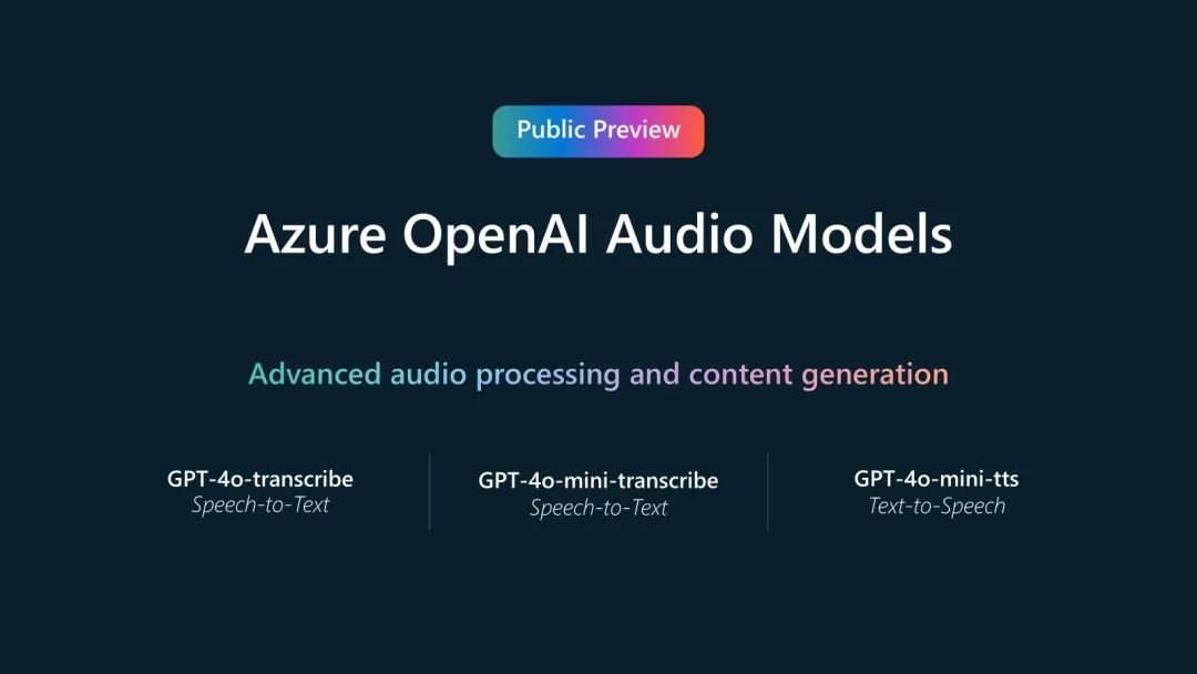 我们很高兴与大家分享,Azure OpenAI 服务(国际版)中的三款高级语音模型 —— GPT-4o-Transcribe, GPT-4o-Mini-Transcribe (语音转文字)和 GPT-4o-Mini-TTS (文字转语音)正式进入预览阶段!用户可在 Azure OpenAI 服务(国际版),选择美东2区域部署使用。