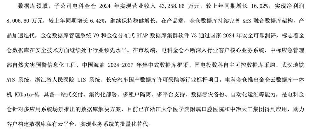 从4月初太极公布的年度财务报表来看,金仓在2024年度收入为4.3亿,相比2023年度同比增加16.02%,净利润约为8000w左右。