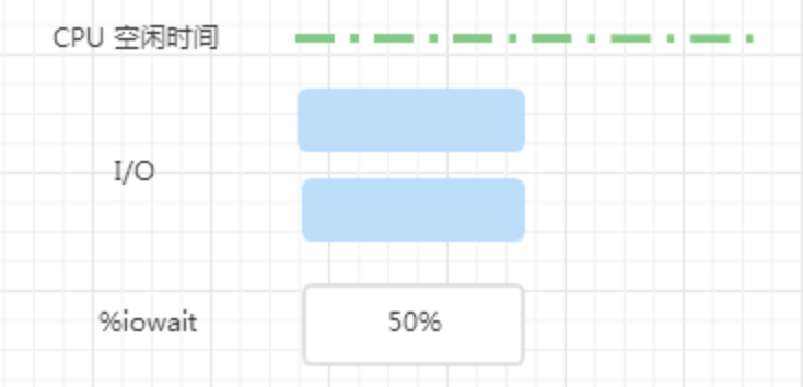 一个周期内,两个 IO 依次提交,左图的 CPU 一直处于繁忙状态,所以 %iowait 为 0%,右边的 CPU 繁忙时间只有左边的一半儿,另一半时间是空闲时间,因此 %iowait 为 50%,可以看到,IO 并没有变化,%iowait 确升高了,其实是因为 CPU 空闲时间增加了而已。