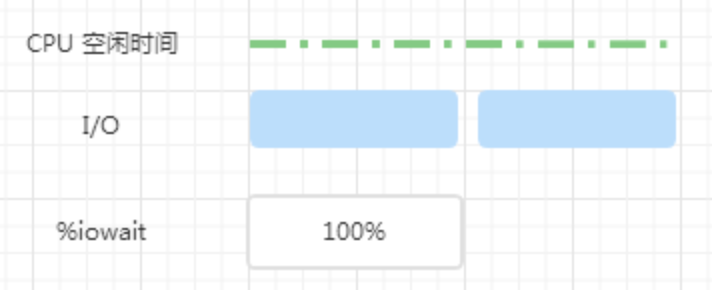 上图中,一个周期内,CPU 一直处于空闲状态,两个 IO 依次提交,整个周期内始终有 IO 再进行,所以 %iowait 为 100%。