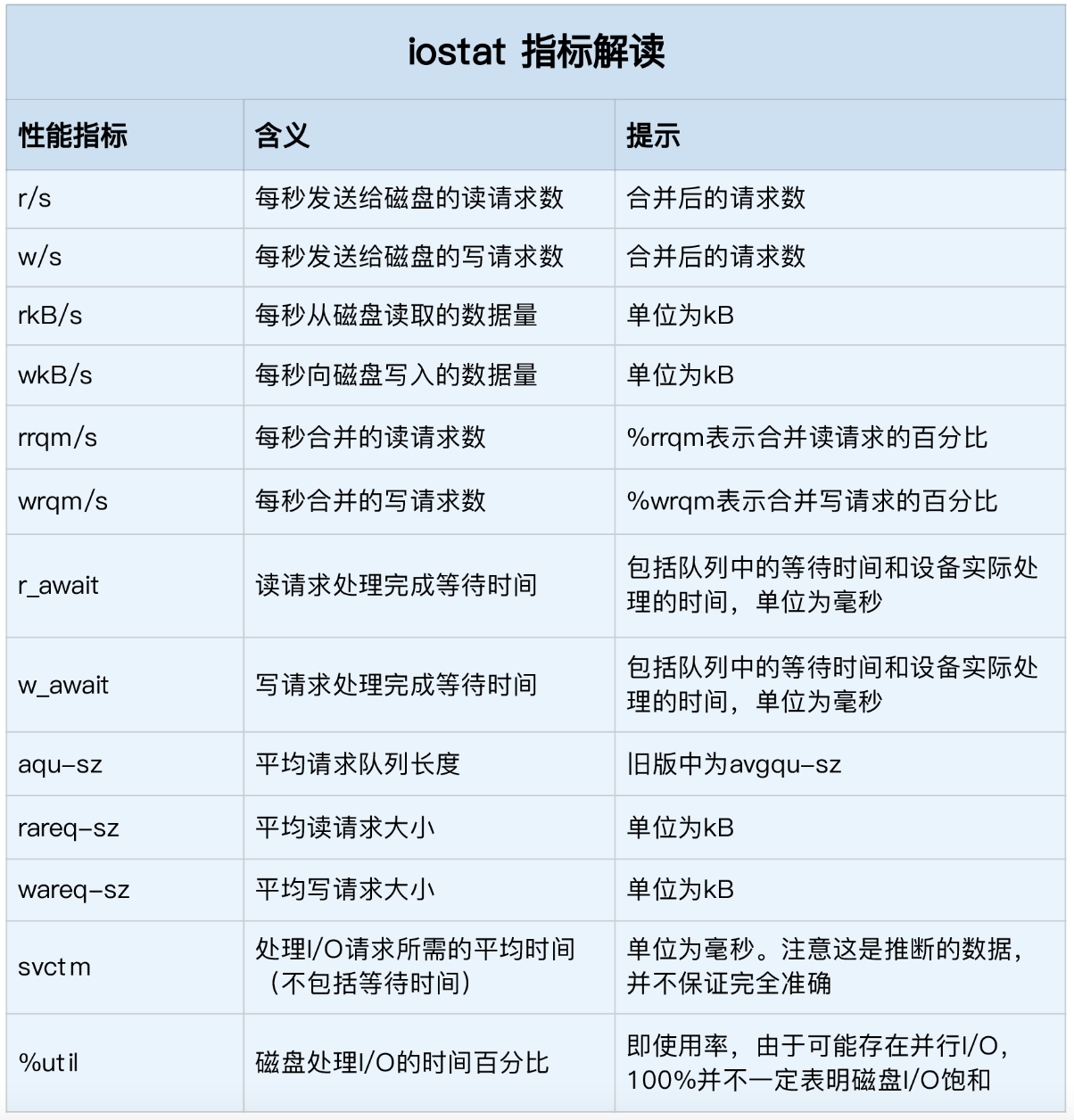 从这里你可以看到,iostat 提供了非常丰富的性能指标。第一列的 Device 表示磁盘设备的名字,其他各列指标,虽然数量较多,但是每个指标的含义都很重要。为了方便你理解,我把它们总结成了一个表格。