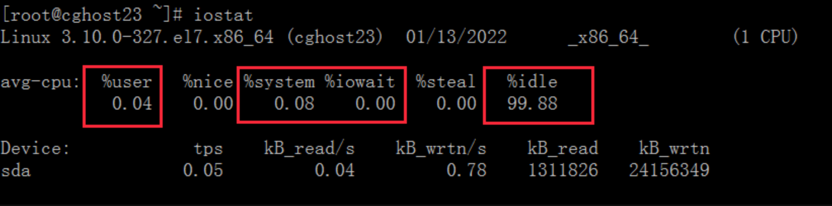 每个CPU 可以处于以下状态之一: user, sys, idle, iowait , 我们通过 iostat工具可以看到这几个状态的值,它们都是以百分比的形式显示的,CPU 是在这几个状态之间切换,所以这几个值总和是 100%。