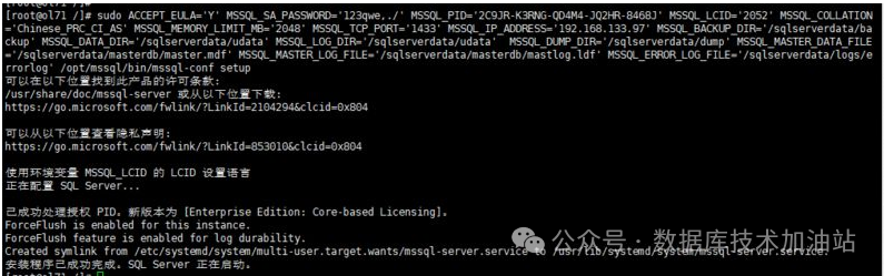 sudo ACCEPT_EULA='Y' MSSQL_SA_PASSWORD='123qwe,./' MSSQL_PID='2C9JR-K3RNG-QD4M4-JQ2HR-8468J' MSSQL_LCID='2052' MSSQL_COLLATION='Chinese_PRC_CI_AS' MSSQL_MEMORY_LIMIT_MB='2048' MSSQL_TCP_PORT='1433' MSSQL_IP_ADDRESS='192.168.133.97' MSSQL_BACKUP_DIR='/sqlserverdata/backup' MSSQL_DATA_DIR='/sqlserverdata/udata' MSSQL_LOG_DIR='/sqlserverdata/udata' MSSQL_DUMP_DIR='/sqlserverdata/dump' MSSQL_MASTER_DATA_FILE='/sqlserverdata/masterdb/master.mdf' MSSQL_MASTER_LOG_FILE='/sqlserverdata/masterdb/mastlog.ldf' MSSQL_ERROR_LOG_FILE='/sqlserverdata/logs/errorlog' MSSQL_AGENT_ENABLED='true' /opt/mssql/bin/mssql-conf setup