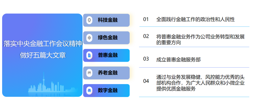 中央金融工作会议明确提出做好“普惠金融”这篇大文章,体现了我国金融工作以人民为中心的价值取向。国务院同步也下发了《关于推进普惠金融高质量发展的实施意见》,明确了发展普惠金融业务的总体要求。