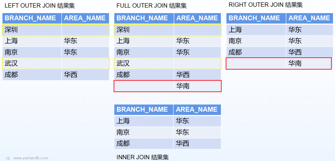 二者对于结果集中满足JOIN条件的行是一样的,但OUTER JOIN会额外返回不满足条件的行,并将不匹配的部分用NULL补齐。下面对比二者结果集差异: