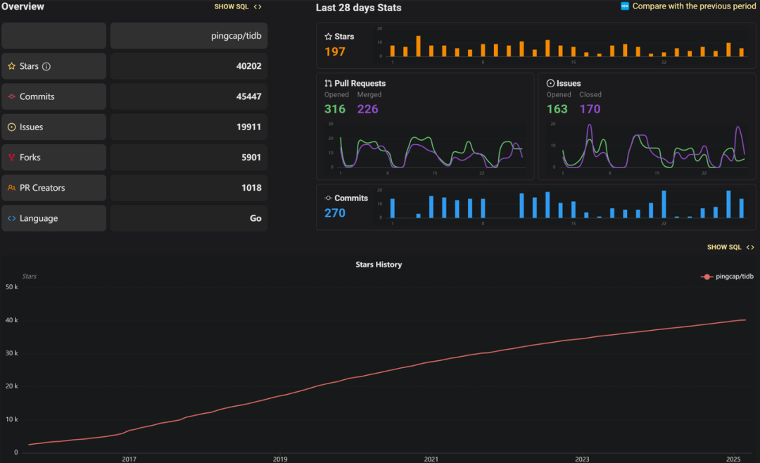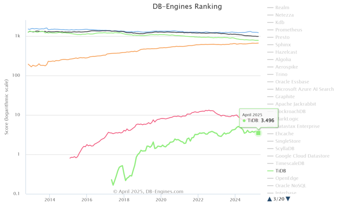 随着全球数字化转型大潮来临,企业对数据库的需求已从简单的数据存储与计算演变为对更高并发、实时分析、弹性伸缩、智能分析等原生能力的综合考验。全球的数据库市场也经历着从集中式到分布式、从单机到云原生、从关系模型到复杂多模的转变。在这一浪潮之中,一股中国技术力量引领这场变革,正在悄然重塑行业格局。过去以 Oracle 为代表的传统数据库受限于集中式架构扩展性不足、高昂的运维成本、不甚灵活的扩展能力正受到越来越多的挑战;而云厂商的数据库托管服务虽解决了部分问题,却也面临跨云部署、混合负载支持上短板等难点。行业急需一种融合分布式架构,满足云原生弹性、混合负载、AI 多模态处理能力的新一代数据库。为此,分布式数据库大量涌现,其中以分布式数据库-TiDB 表现尤为亮眼。其原生分布式设计突破单机性能天花板,HTAP 引擎满足事务与分析混合负载需求,向量检索功能则直接响应 AI 时代的多模态数据处理需求。在近期国际权威的数据库活跃度排行榜-DB-Engine,表现非常出色。