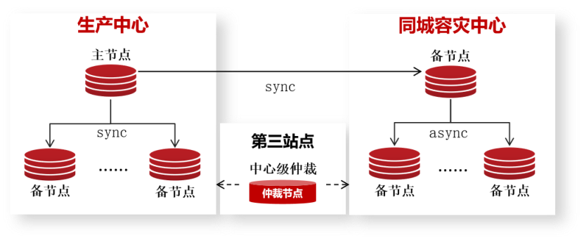 第三方仲裁节点即中心级仲裁observer节点,部署在单独的设备之上,与生产中心和同城灾备中心之间网络独立。跨中心的快速故障切换依赖部署于第三中心的仲裁节点。